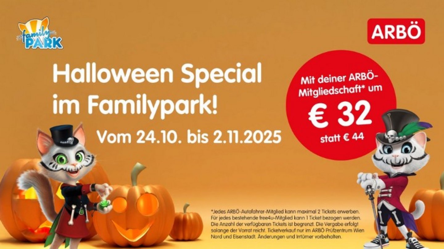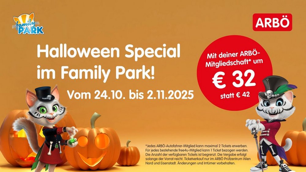 Vom 24. Oktober bis 2. November 2025 verwandelt sich der Familypark in ein gruseliges Abenteuerland für Groß und Klein. Mit der ARBÖ-Mitgliedschaft gibt es die Tickets zum Vorteilspreis.