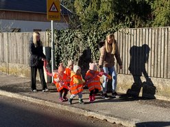 Mädchen und Buben erhielten Spazierraupen und Kinderwarnwesten vom ARBÖ überreicht