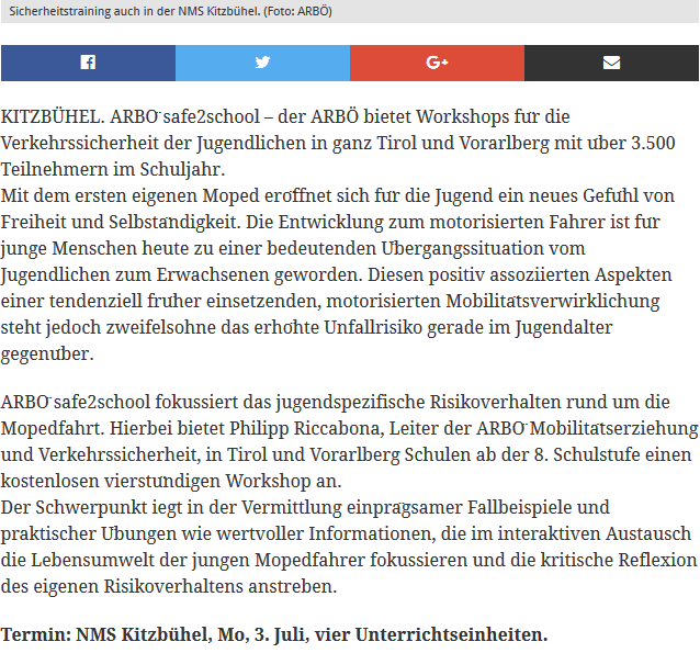 Quellen, die den Medienberichten im Gesamten zugrundeliegen: u.a. Bezirksblätter, Bezirksblätter Online, Salzburger Nachrichten, Kitzbüheler Anzeiger, LehrerIn und Gesellschaft Salzburg, Tiroler Tageszeitung, Osttirol Heute, Regionews.at, Tagesbote, LLA Lienz, Wann und Wo Vorarlberg, Tiroler Kronenzeitung, Neue Vorarlberger Tageszeitung, Jahresbericht NMS Imst-Oberstadt, Söller Akzente, Red Bull Salzburg, Onlineblatt.at, APA-OTS, Kirchberger Zeitung, Kaiserwinkel aktuell, Schaufenzter Zirl, Stadtmagazin Kufstein, Rathausinfo Schwaz, Magazin Polyaktiv, Stadtmagazin Wörgl, Rofankurier, Verkehrsverbund Tirol, Netzwerk Verkehrserziehung, Gemeindezeitung Silz, Gemeindezeitung Kössen, Gemeindezeitung Niederndorf, Tiroler Landeszeitung, Osttiroler Bote, Bahnhofcenter Innsbruck, Rundschau, Tiroler Grenzbote, Kufsteinblick, Gemeindezeitung Nußdorf-Debant, Osttirol Journal, ARBÖ Klubmagazin Freie Fahrt Tirol und Vorarlberg.