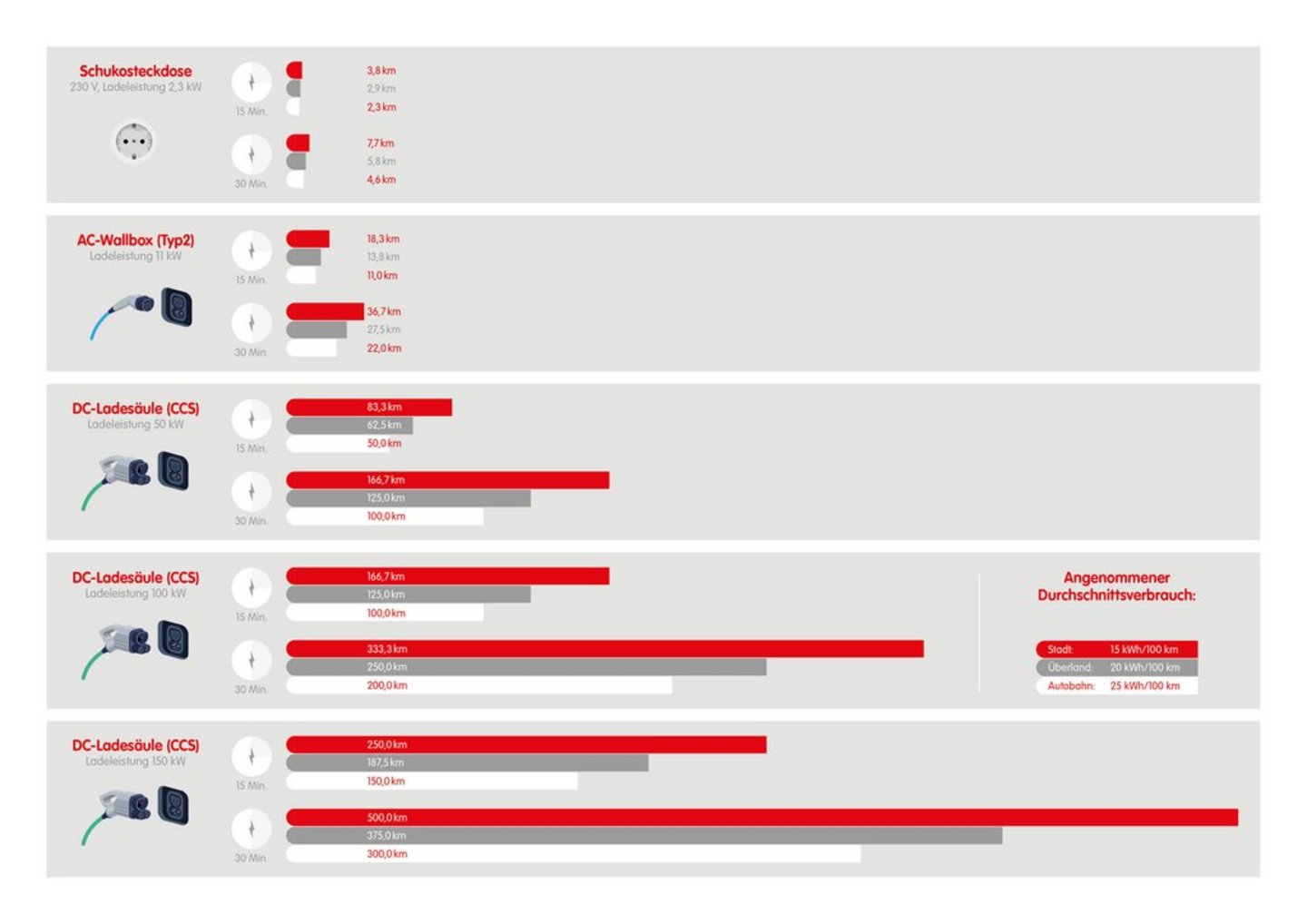 Dies bezieht sich auf einen Ladezustand von in der Regel über 80 Prozent. Je „voller“ ein Akku ist, umso „wärmeintensiver“ wird der Ladevorgang. Man könnte theoretisch mit voller Ladeleistung weiterladen – würde den Akku aber massiv überhitzen und zerstören. Für die hohen Ladeleistungen jenseits der 100 bis 150 kW gelten die 80 Prozent natürlich ebenfalls nur selten. Unter idealen Bedingungen ist hier ein Ladezustand von 30 bis 70 Prozent für die maximale Ladeleistung als realistisch anzusehen.