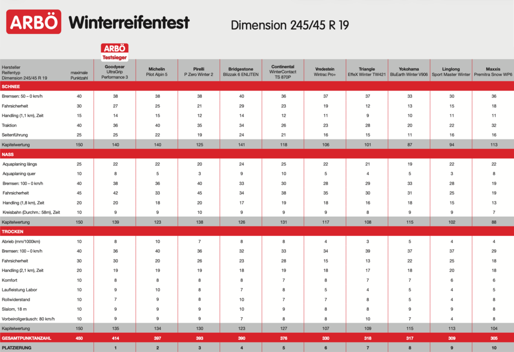 Obgleich schneebedeckte Straßen seltener werden: Grip bleibt im Winter entscheidend. Bridgestone, Goodyear und Michelin überzeugen hier mit sehr guter Traktion und hoher Fahrsicherheit. Der neue Pirelli bietet ebenfalls ordentliche Schneeeigenschaften und positioniert sich vor Continental, Maxxis und Vredestein, die nur befriedigende Ergebnisse erreichen. Drei Kandidaten bleiben hinter den Erwartungen zurück: Triangle erweist sich im Grenzbereich als instabil. Linglong bietet die geringste Fahrsicherheit. Schlusslicht ist der Yokohama mit schwacher Traktion, unzureichender Seitenführung und eingeschränkter Fahrstabilität.