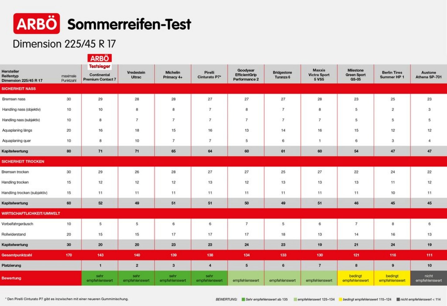 Die Ergebnisse unterstreichen, wie wichtig es ist, die Reifen in allen Kategorien intensiv zu testen. Nur ein wirklich sicherer Pneu bringt eine konstant gute Leistung. Neben den Aspekten der Verkehrssicherheit werden auch Vorbeifahrgeräusche und Rollwiderstand bewertet. Gesamtsieger in unserem Test ist klar der Continental. Er konnte in allen Disziplinen der Verkehrssicherheit überzeugen und bietet in unserem Testfeld die größte Sicherheit. Einziger Makel: Er ist von allen Reifen der lauteste und auch der teuerste. Sehr empfehlenswert sind zudem Vredestein, Michelin und Pirelli.