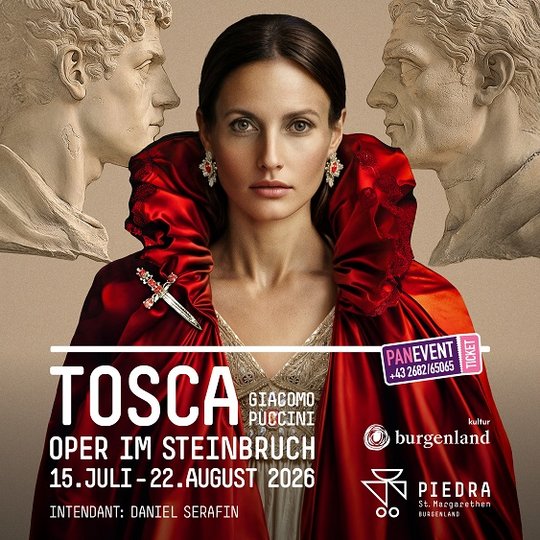 Eine Geschichte um Liebe, Eifersucht, Gewalt und Intrigen trifft auf atemberaubende Klänge: Mit Giacomo Puccinis Melodramma Tosca kehrt 2026 eine der beliebtesten Opern der Welt in den Steinbruch St. Margarethen, auf die schönste Freiluftbühne Europas, zurück.